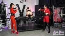 The lesbian slut writhes and moans, her face contorted with pleasure as the whip strikes her exposed buttocks. Her pussy drips and her whole body trembles with excitement and lust.